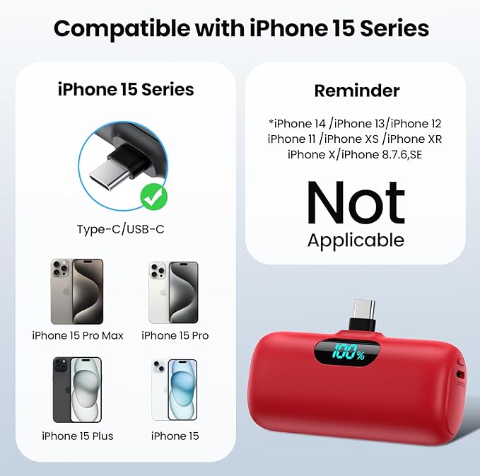 - Special Feature : Mini Power Bank Compatible With iPhone 16/16 Plus/16 Pro/16 Pro Max,iPhone 15/15 Plus/15 Pro/15 Pro Max ,Mini size, Lightweight, Cordless Portable, Lipstick Size, Slim, Pocket Size,15W PD quick Charge , Airline Approved Safest Cell Phone Charger Power bank,Airline Approved Safety Travel USB-C Charger Mini Power Bank Compatible With iPhone 16/16 Plus/16 Pro/16 Pro Max,iPhone 15/15 Plus/15 Pro/15 Pro Max ,Mini size, Lightweight, Cordless Portable, Lipstick Size, Slim, Pocket Size,15W PD quick Charge… See more