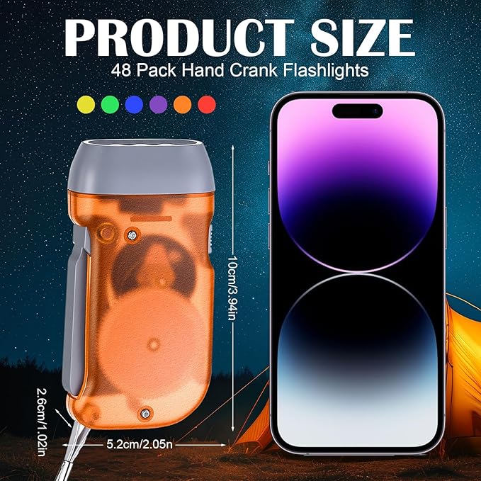 - Value Package: you will get 48 hand crank LED flashlights in 6 colors, namely red, blue, purple, orange, yellow and green, each color has 8; Ample quantity and various colors can meet your use and replacement needs in daily life, you also can share them with your family, friends and neighbors