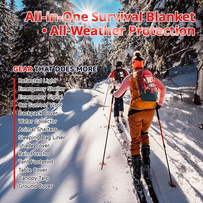 - VERSATILE SURVIVAL SUPPLIES: Serves as a shelter, shield,poncho,shade, ground cover, or emergency signal, enhanced by its oversized, tear-resistant build. Perfect for marathons, wilderness survival, camping, running, hiking, earthquake disaster scenarios or first aid, this reusable emergency blanket ensures long-term reliability, adapting to diverse needs for safety in unpredictable situations