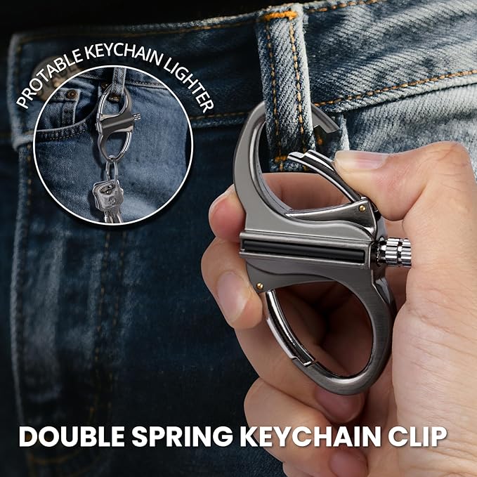 - METAL KEYCHAIN LIGHTER: The metal keychain lighter match strike has a design of two durable carabiners and integrates a durable flint metal permanent match lighter, offering both style and functionality. Note: For transportation safety reasons, the lighter does not contain fuel and needs to be filled with fuel before use, kerosene or lighter fluid