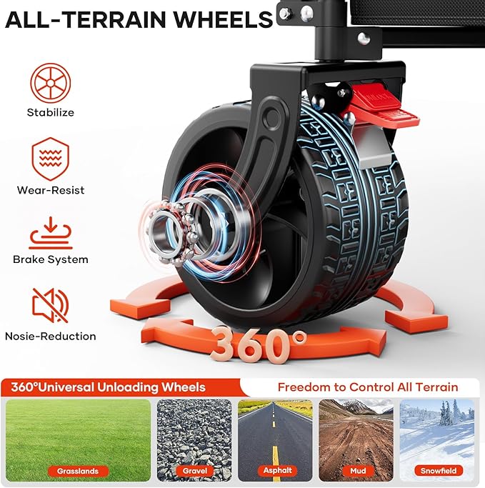 - All Terrain Big Wheels: Equipped with upgraded all-terrain wheels, our collapsible wagon cart glides smoothly over sand, grass, gravel, and uneven ground. The wide wheels with deep treads prevent sinking and make it the perfect companion for beach days, garden parties, or outdoor adventures.