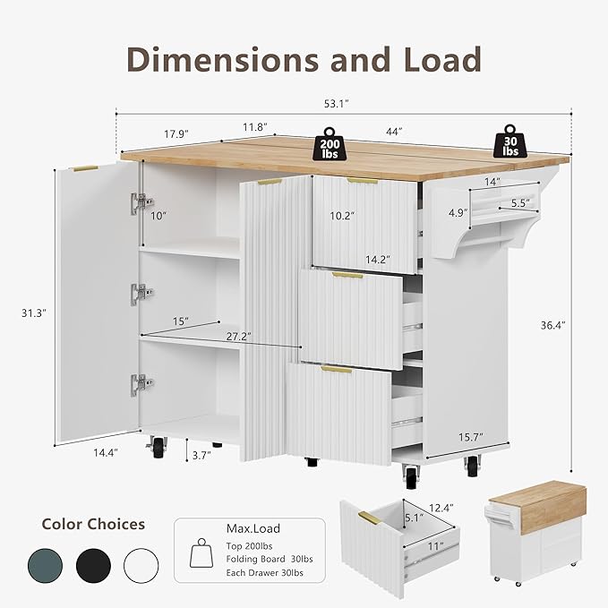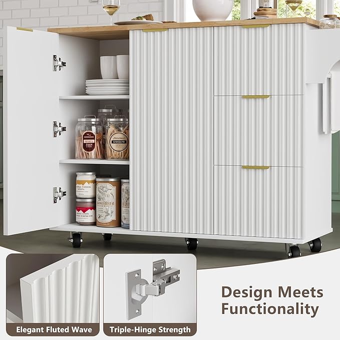 - 【Modern Farmhouse Style Fusion】This portable kitchen island features a sleek white finish and fluted texture design to create a kitchen island that perfectly blends rustic warmth with a modern edge—perfect for both casual kitchens and formal dining spaces