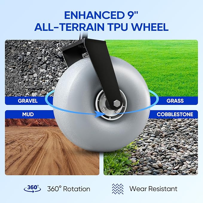 - 9" All-Terrain Balloon Wheels: Equipped with 9-inch all-terrain balloon wheels that rotate 360°, this wagon glides effortlessly over sand, gravel, grass, and other rough surfaces. Includes a portable air pump—inflate the wheels to just 4–5 PSI for optimal performance (no need to overinflate).