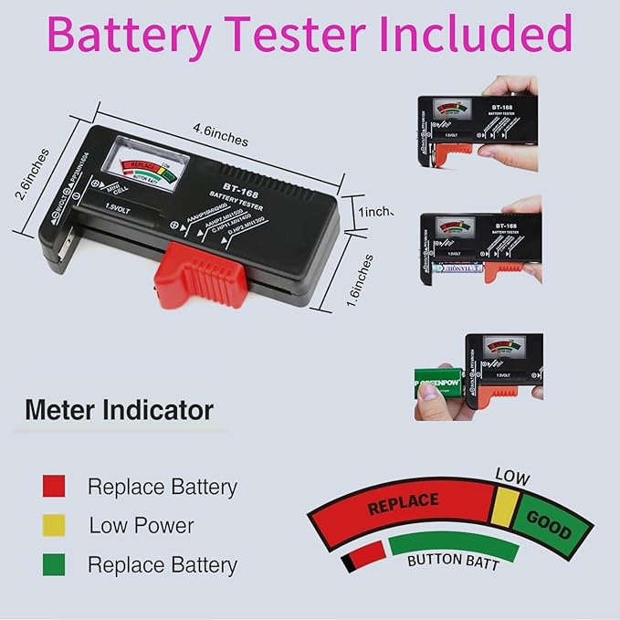 - 【Battery Organizer Storage Case with Tester】This battery storage organizer comes with a free battery tester, can check whether your rechargeable batteries or single-use batteries is still good. The tester also can help you quickly know the battery power, which is a good helper for batteries