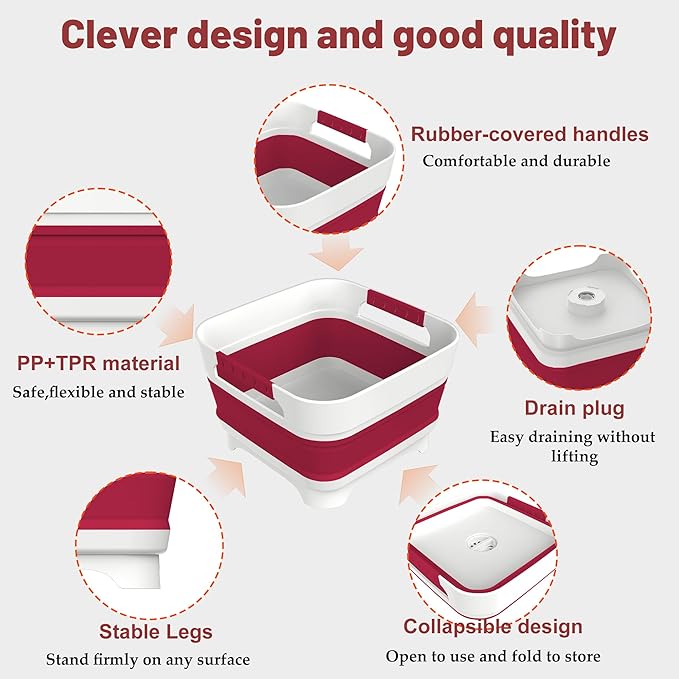 - 【Improved Design】: Our upgraded collapsible dish tub now features rubber-covered handles for a more comfortable grip and increased durability. This collapsible dish drainer is perfect for washing dishes, bowls, vegetables, and pump parts.