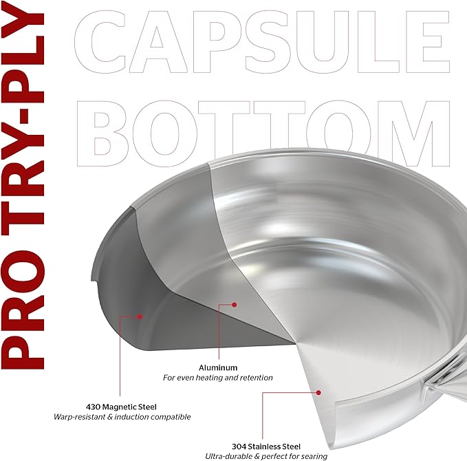 - Seamless Tri-Ply Construction: Built with a three-layer frying pan — food-grade stainless steel interior, aluminum core, and premium stainless steel exterior — for outstanding heat conductivity, durability, and cooking performance.