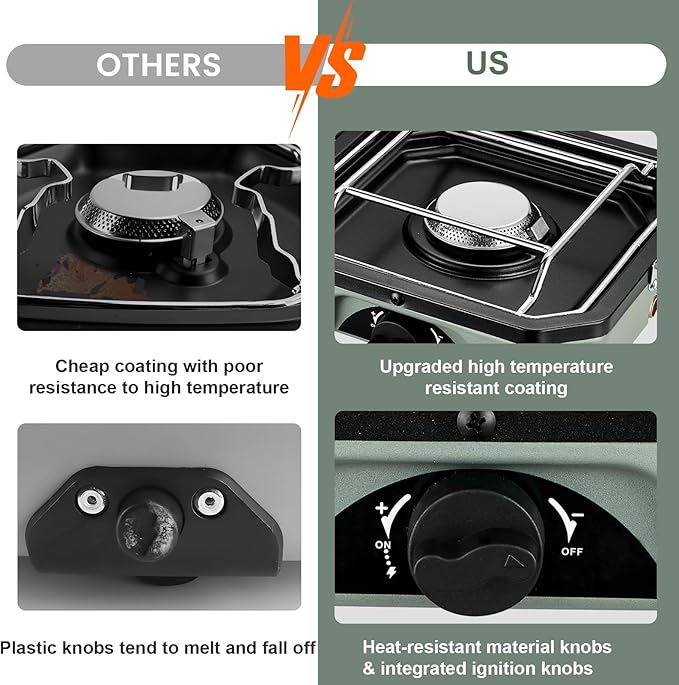- Adjustable Firepower: The upgraded control knob of the camp stove features piezo ignition and rotary button adjustment, which is easy to ignite the burner; Multiple burner levels can be adjusted freely with just one button, easily coping with different cooking methods. Each burner features with an independent control knob, and precise heat control makes the propane last longer