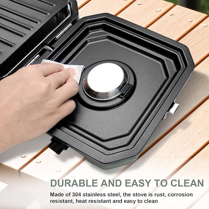 - Durable Materials: The portable camping stove is made of heat-resistant steel, making it sturdy and durable. The surface of the stove body and grill tray is non-stick coated, ensuring a rust-proof and non-stick finish. This propane stove is compatible with most propane bottles. The non-slip feet keep it stable on any surface, preventing spills and tipping. In addition, the burner system is carefully designed to prevent gas leaks, ensuring a safe cooking environment