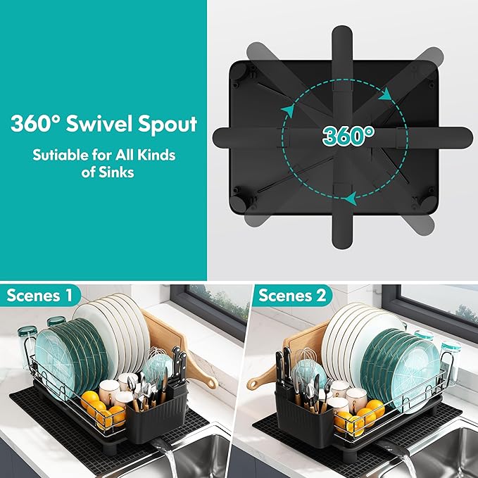 - Efficient Drain: Includes dish rack with drain tray, guided channels + extended and rotated spout route water smoothly to sink to prevent leftover drips on counter
