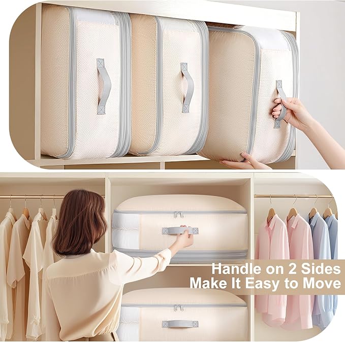 - [Dual Reinforced Handles for Easy Access] Equipped with two strategically placed handles—one on the front and one on the side—our blanket storage bag allows you to easily pull it out whether it's stored horizontally or vertically. The reinforced stitching of the whole bag ensures sturdy support, making it effortless to move or reorganize even when the comforter storage bag is fully packed