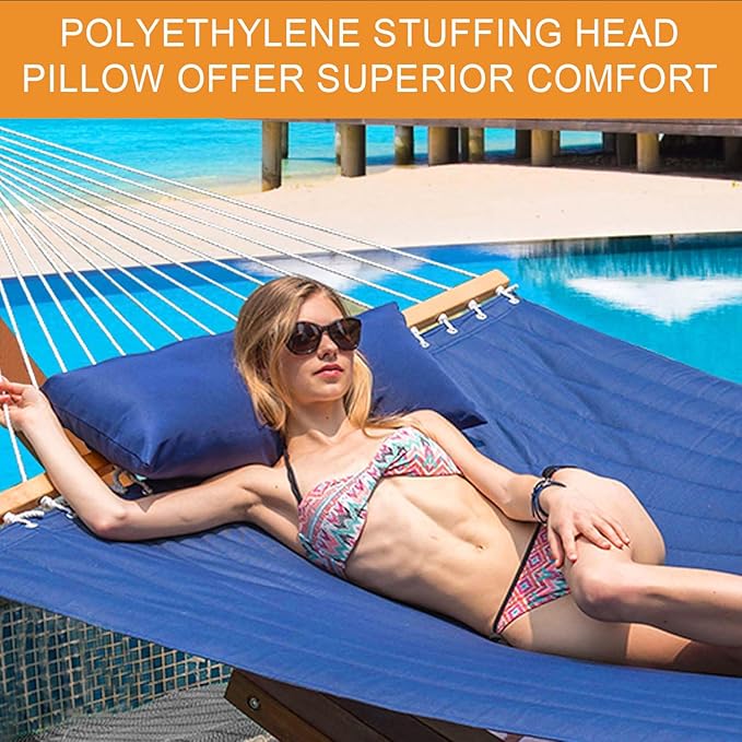 - SUPER COMFY: The double-layered quilted polyester with inner polyester padding and a polyethylene stuffing head pillow offer superior comfort. This quilted hammock can give you a cloud-like comfortable experience. Lying on it is like being in a warm embrace. No matter it's in summer or winter, this hammock will always be your first choice for relaxation