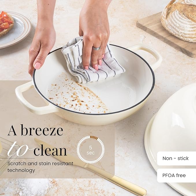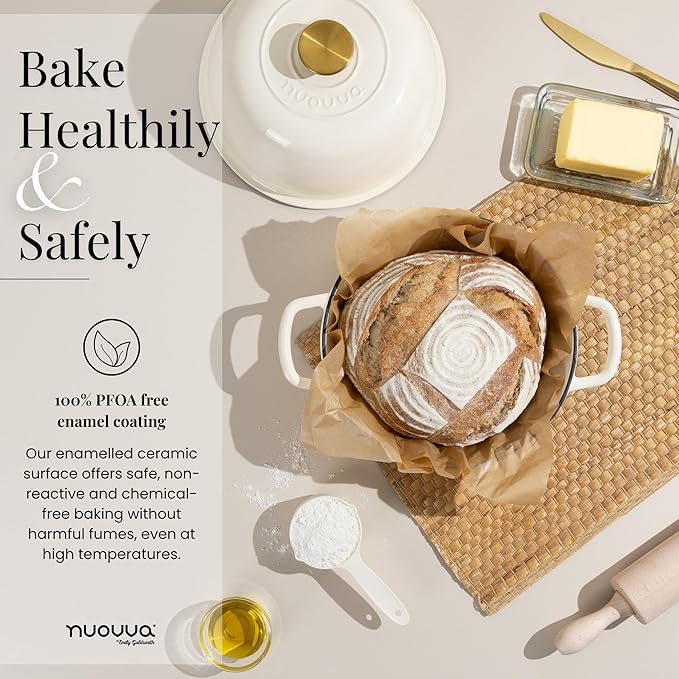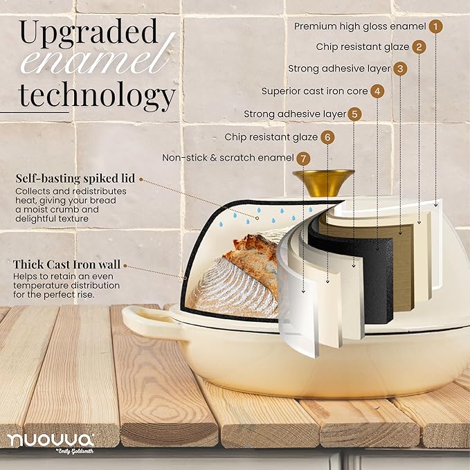 - ENAMELLED FINISH: The enamelled surface of the cast iron dutch oven pot by Nuovva is non-reactive, making it safe for all types of dough and ingredients. It resists rust and scratches, ensuring your pot remains in pristine condition for years. The smooth enamelled finish makes cleaning effortless!