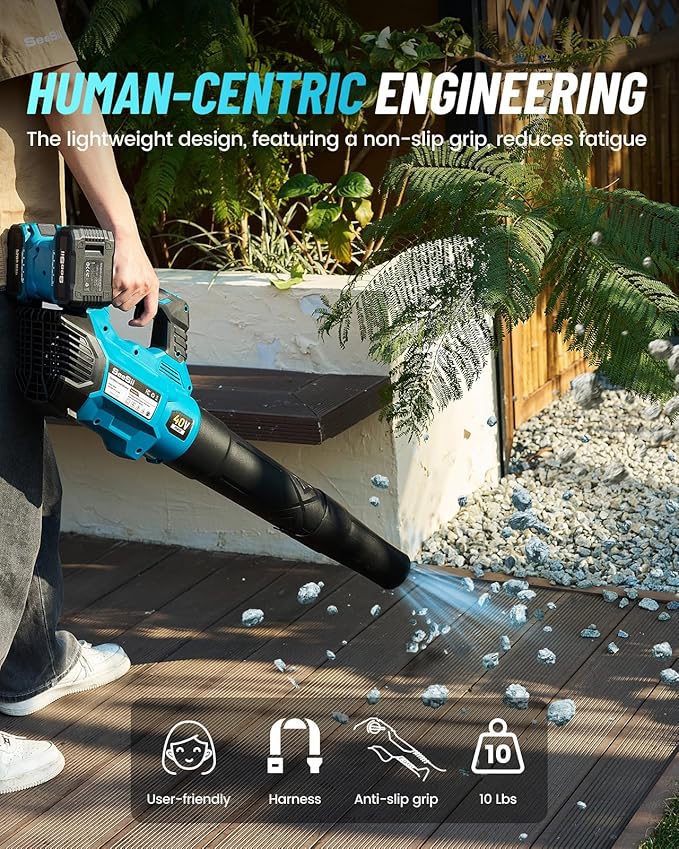 - Powerful Airflow for Efficient Clearing: SEESII 40V leaf blower cordless is designed with up to 680 CFM and wind speeds of 210 MPH, the powerful airflow easily blows away heavy wet leaves, clears debris and dust from lawns, and even sweeps away small stones, making it ideal for tackling a wide range of outdoor cleaning tasks.