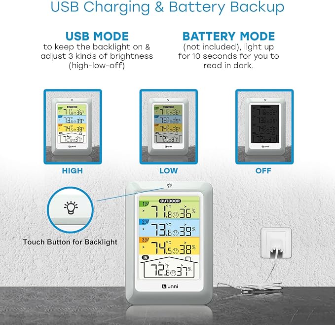 - DISPLAY 3 SENSORS DATA, TRANSMISIION 328FT/100M – Unni has advanced patented wireless technology that provides more powerful and steady data transmission. Wireless temperature humidity monitor updates and transmits temperature and humidity data up to 330 ft radius every 30 seconds, that will help you monitor all the locations you care about the most.