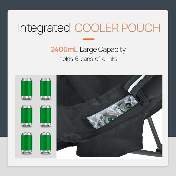 - 【Spacious and Functional for Outdoor Comfort】With a 23.6" wide seat, this oversized chair offers ample space and support for most adults. Includes a side cup holder for hands-free sipping and a built-in insulated cooler bag to keep your drinks chilled and close at hand.