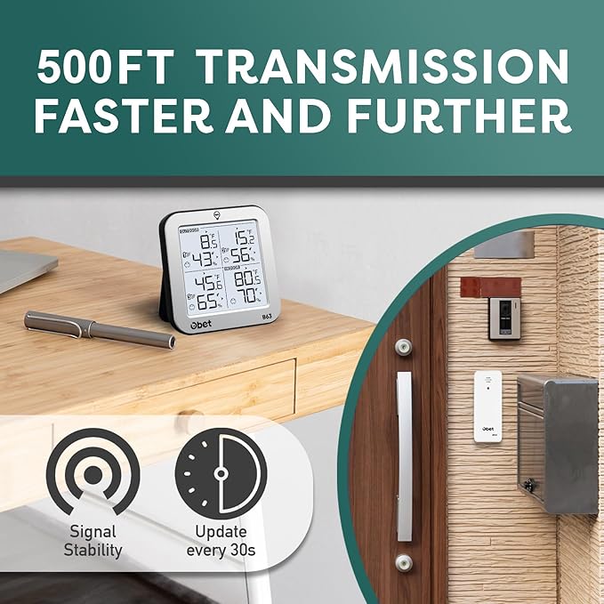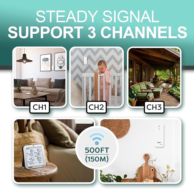 - Indoor Outdoor Thermometer with 3 Sensors: Stable signal transmission system with 3 sensors, ensuring accurate real-time readings for multiple locations. Up to 500ft (150m) long range for RV, living room, bedroom, garage, incubator or garden.