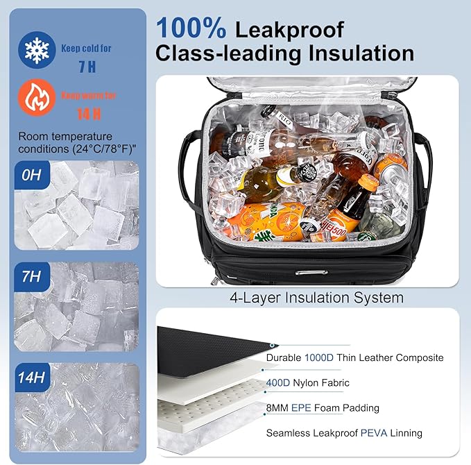 - 【Leakproof & Insulated Backpack Cooler】Backpack cooler Crafted with 8 mm foam insulation padding, Soft cooler backpack maintains food temperatures for up to 16 hours. Backpack ice chest adapt the seamless hot pressing process ensures a leak-proof silver PEVA lining, Further reinforced by smooth horizontal zippers to prevent leaks. Backpack coolers insulated leak proof ideal for beach picnics, hiking, camping, travel, boating, baseball games and work.