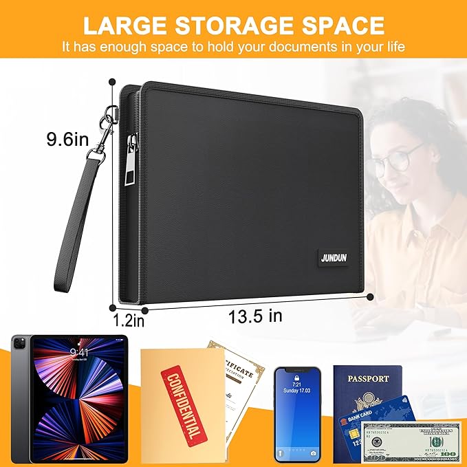 - Large Opening Design:the size is 13.5x9.6 inch .fireproof money bag for cash is thicker than ordinary zipper bags .It is large enough to store Letter size or A4 important documents such as money ,cash ,passport ,certificate and bank cards.Fireproof waterproof document bag has a large opening allowing, effortless insertion and removal of documents without folding or struggling .This easy-access design, combined with robust fireproofing, makes it the secure and practical solution for safeguarding your essential papers and valuables