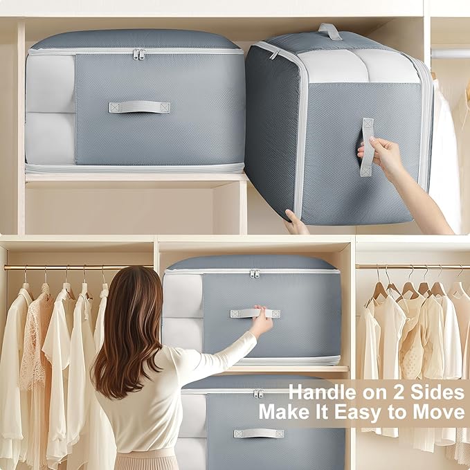 - [Dual Reinforced Handles for Easy Access] Equipped with two strategically placed handles—one on the front and one on the side—our blanket storage bag allows you to easily pull it out whether it's stored horizontally or vertically. The reinforced stitching of the whole bag ensures sturdy support, making it effortless to move or reorganize even when the comforter storage bag is fully packed