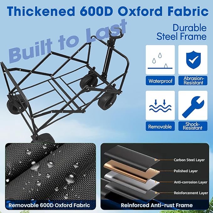 - 【Sturdy & Waterproof Premium Materials】: Made of high-quality 600D premium Oxford fabric, it can hold 420LBS load capacity. The wagon cart is sturdy, long-lasting and water, scratch, tear and wear resistant. Easily handle severe weather and heavy loads conditions. Enjoying outdoor activities with peace of mind