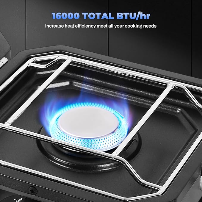 - DUAL BURNER DESIGN: The portable gas stove features a dual burner setup with two adjustable burners that allow you to cook up to 2 pans or pots up to 10 inches in diameter at the same time, providing versatility in your camping kitchen