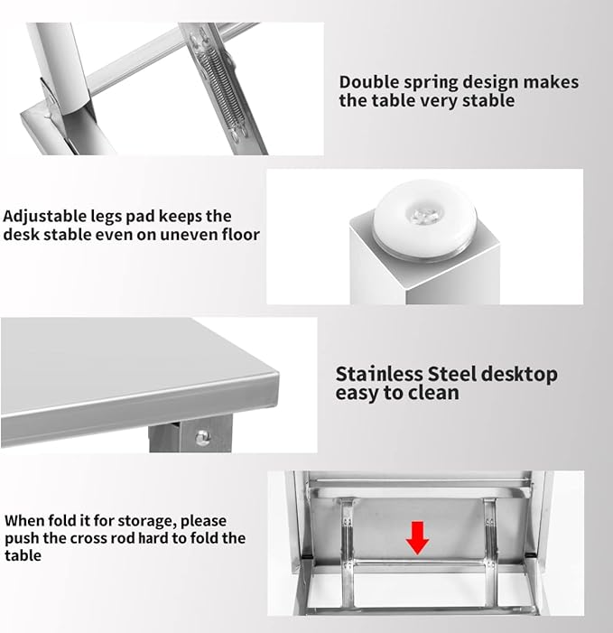 - Folding table. Thickened stainless steel countertop to prevent it from deformation easily,and polished smooth without any sharp edge