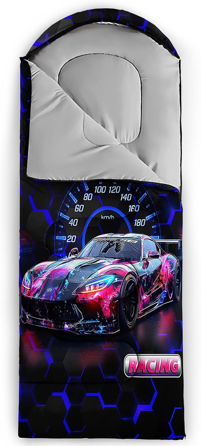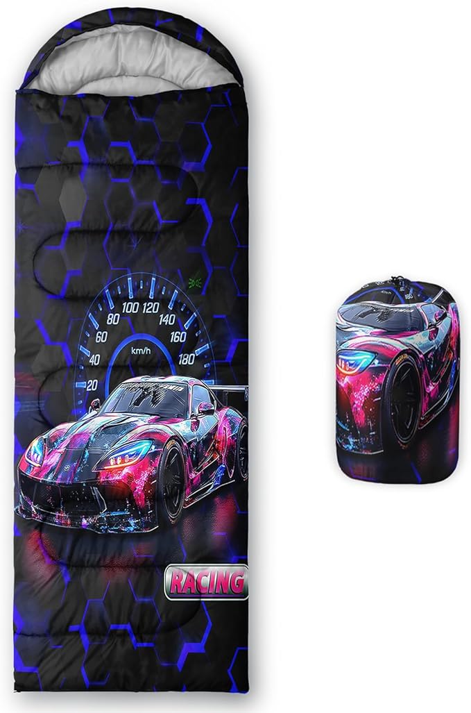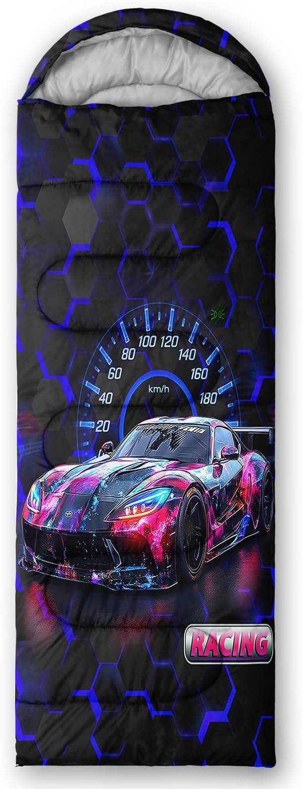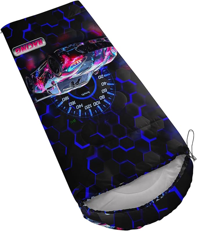 - Unique Racing Car Design:This Racing Car pattern sleeping bag is made of 3D digital printing with vibrant colors and patterns,size: 31W x 90L inches,temperature range: 32℉-77℉ (0℃-25℃),it also also have a weather resistant waterproof design to keep you warm and prevent you from any dampness,can be used in 3 seasons