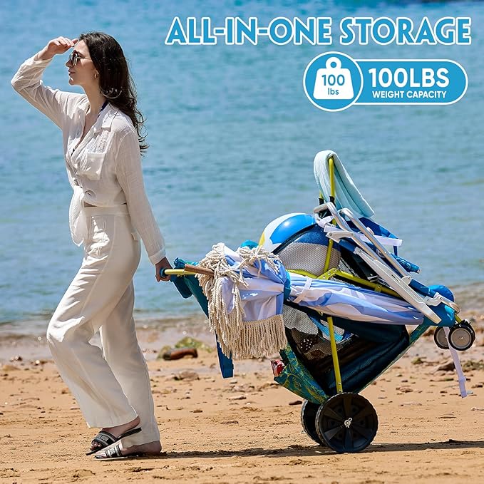 - Spacious Mesh Storage with 100lbs Capacity: Featuring a large mesh storage basket, this heavy-duty beach wagon holds up to 100lbs, providing ample space for all your beach, camping, or outdoor gear