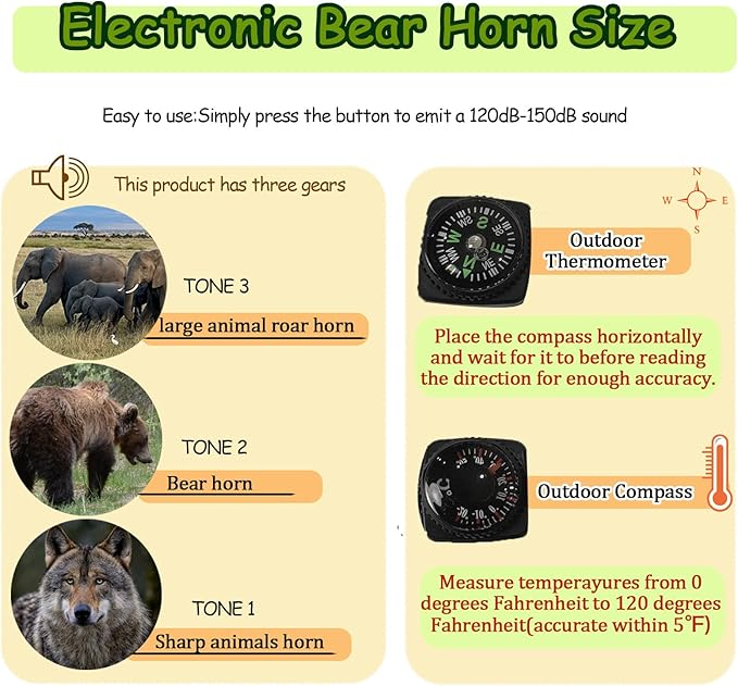- 【Multi-function and Easy to Carry】This bear horn contains compass and thermometer functions, with the thermometer reading from 0°F to 120°F. Weighing only 2.8 oz, it can be effortlessly handled with one hand and attached to a backpack for quick access during outdoor activities, camping, backpacking, or hiking.