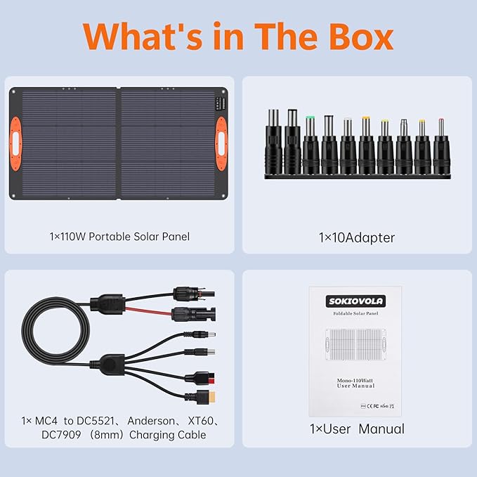 - 【Package and Support】1x SOKIOVOLA 110W Portable Solar Panel,1x7.21ft 4-in-1 solar extension cable( solar to XT60/DC5521/DC7909(8mm)/Anderson) Charging Cable,1x9-in-1 DC connector+DC8020,1x user manual ,We also offer an 24-month warranty and a 30-day refund guarantee from the date of purchase. If you encounter any problems during use,please contact us and we will respond within 12 hours.