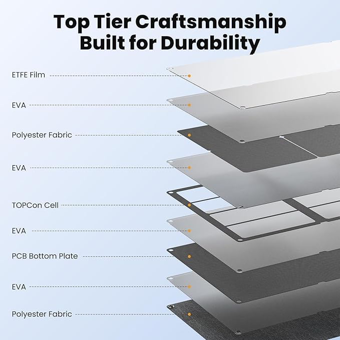 - 【High Conversion Efficiency】SOKIOVOLA 110W solar panel adopts A+ grade 16BB solar technology, with a conversion efficiency of up to 25%.NextGen N-Type solar cell technology not only improves the conversion efficiency and charging speed of the panel, but also enhances its stability and durability. The panels are coated with high-transmittance ETFE material and have a slightly convex surface that increases the contact area with the sunlight and improves the energy conversion rate.