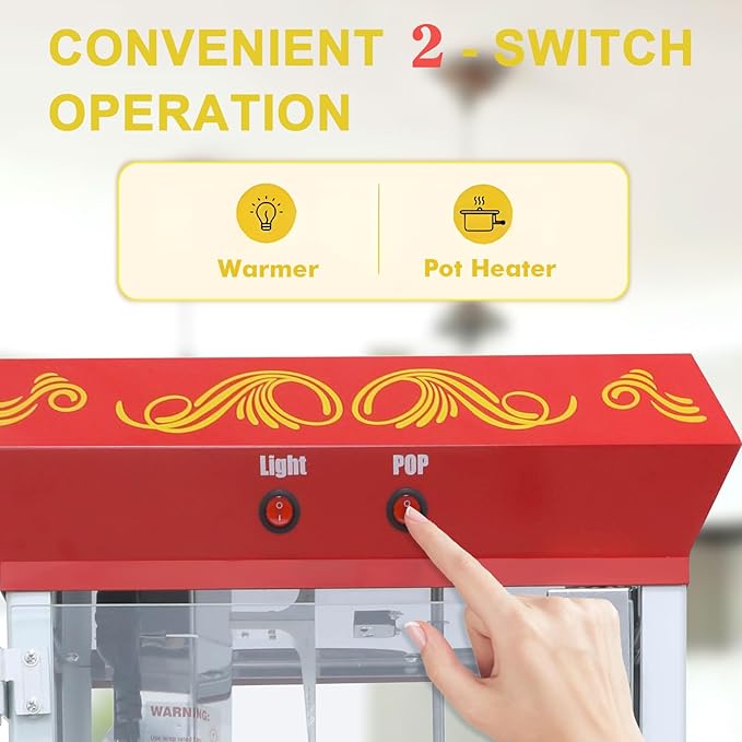 - Easy to Use: Designed with stainless steel and tempered glass food zones, this machine simplifies the popcorn-making process. The 2-switch design gives you independent control over the spot light warmer and the stirrer/pot heater, allowing for efficient and customized operation
