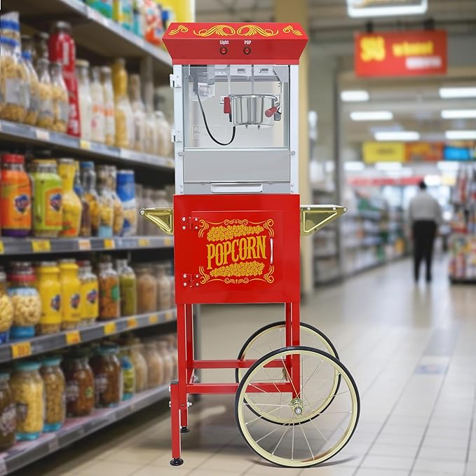 Popcorn Maker Machine - Professional Cart With 8 Oz Kettle Makes Up to 48 Cups, Stainless Steel Vintage Commercial Popcorn Machine Movie Theater Style (Red)