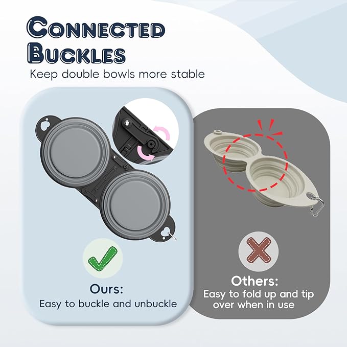 - More Stable Using: Expand two puppy collapse bowls, fasten the two locking buckles at the connection points to securely lock the bowls together. Even if the dog eats voraciously or plays around, it will not easily overturn, significantly enhancing the overall stability of the bowls for optimal feeding experiences.