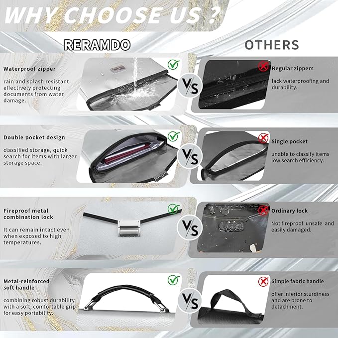 - [TRUSTWORTHY AFTER-SALES SERVICE]RERAMDO is committed to the innovation of fireproof products and providing high quality products and services to our customers. Recommended by professional firefighters to protect your valuables from fire, this fireproof document bag is also perfect as a gift for family and friends. If you have any questions about the product, please feel free to contact us and RERAMDO will do our best to help you.