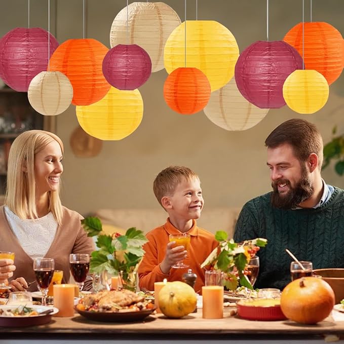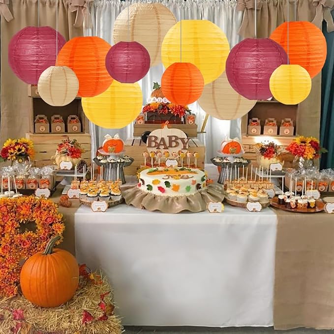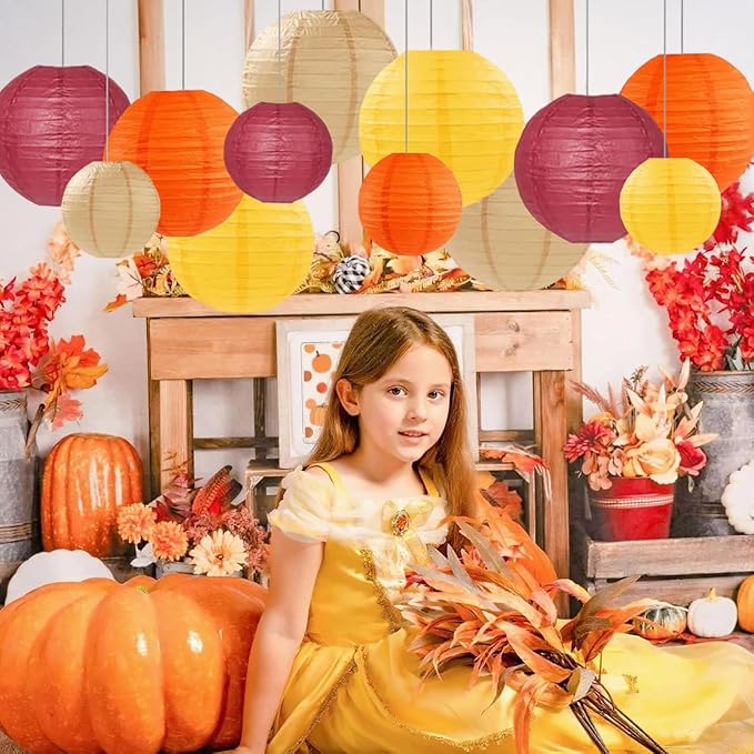 - Paper Lanterns Decor Set: 5 color(maroon,orange,yellow,brown);5 sizes( 4 inch X 4,6 inch X 2,8 inch X 2,10 inchX 2,12 inch X 2)