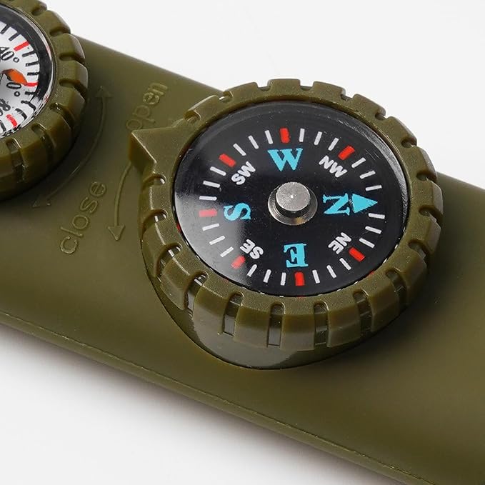 - 1. Multifunctional whistle includes: Emergency whistle + precision compass + temperature-sensitive thermometer + LED signal light + magnifying glass + 360° reflector + sealed info capsule