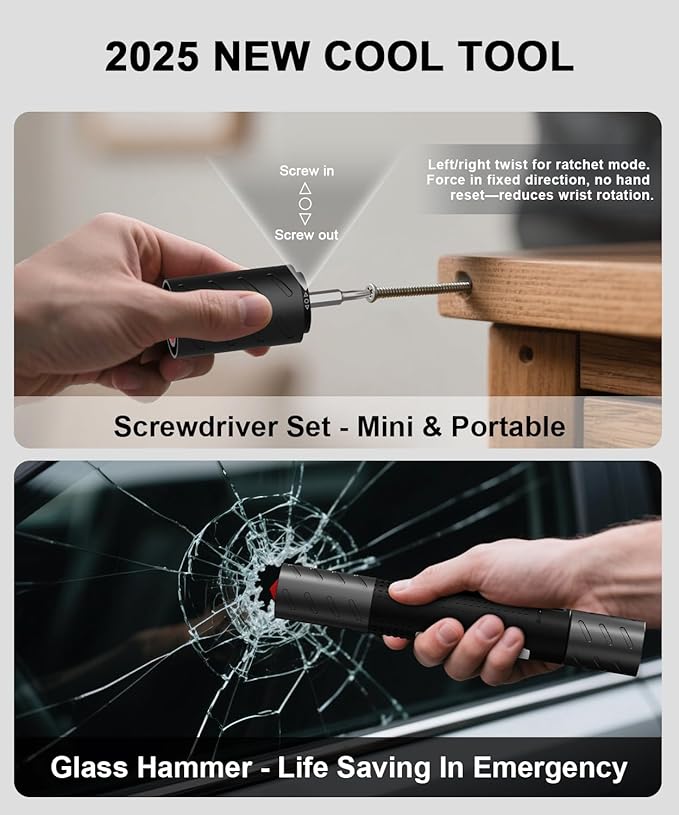 - 2025 4 IN 1 COOL TOOL--- 2025 new design flashlight has a built-in portable and compact screwdriver set with 6 mini CRV steel drill bits which hardness is 45 - 50(Flat Head: SL3/SL3.5, Cross Head: PH0/PH1, Torx: T9, Hex: H2.5) and a window breaker protected by silicone. The hidden pointed tip of the window breaker can break glass when hitting vertically, avoiding accidental injury. It's also a powerful flashlight and COB work light, ideal for outdoor adventures and emergencies.