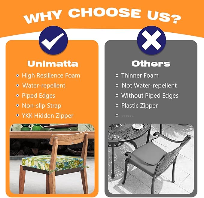 - 【High Resilience Foam】 The Unimatta chair cushions are filled with high-quality 100% foam, high-density sponge offers excellent support and long-lasing comfort. Whether you're enjoying a sunny afternoon or a cool evening, this cushion will keep you cozy.