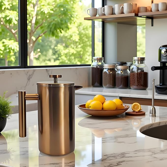 YJX 34oz Coffee Maker, Stainless Steel French Press, 1 Liter Camping Coffee Pot, Tea Maker, 34 Ounce Travel Coffee Presses, Heat Resistant Double Insulated (Coppery)