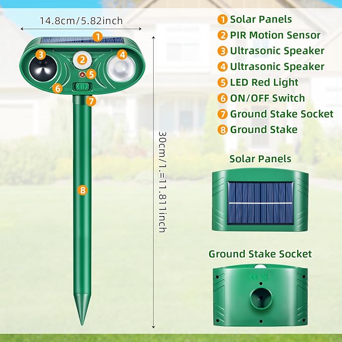 - Easy to Install & Use: For the first use, charge the solar panel in direct sunlight for 2 days. After assembling the animal deterrent, select a right place to insert , ensuring sufficient direct sunlight and covering the area to be protected, preferably about 9-10 inches above the ground.
