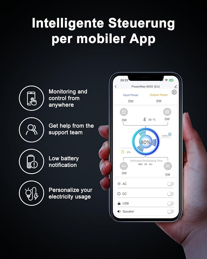 - [2200W Fast Charging] 0-100% in 1.44h with 2200W AC input and 2400W solar input. Powermax 6000 uses a 2200W bi-directional inverter, you will get a fast charging speed while using AC charging cable.The capacity from 0% to 100% can be completed within 1.96 hour.