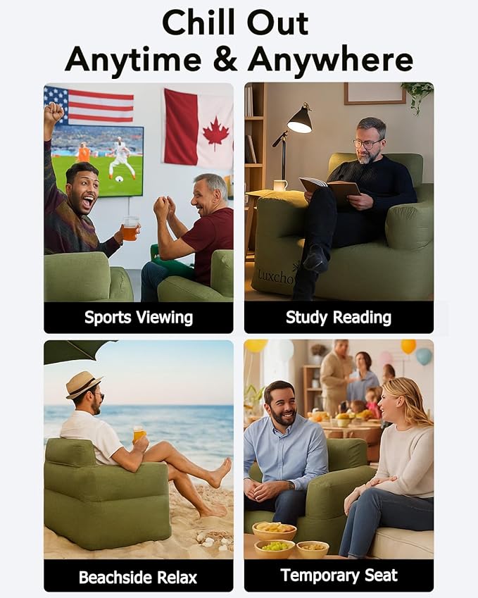 - Easy to Clean & Maintain: Wipe with a damp cloth or wash the removable cover to keep your blow up chair fresh. Minor air loss during first use is normal due to PVC flexibility—just top up a few times