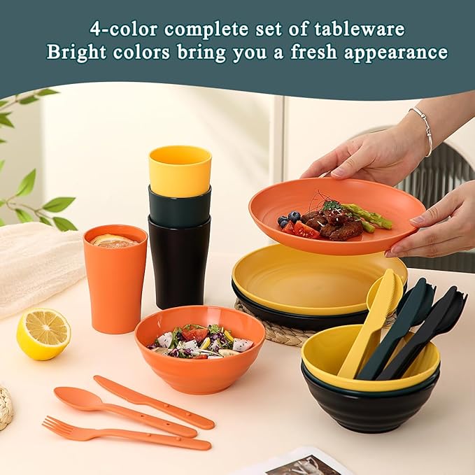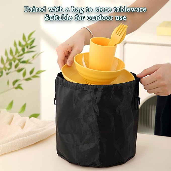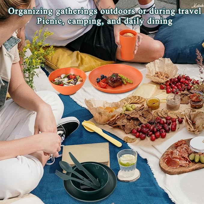 Camping Mess Kit for 4 with Bowl, Plate, Cup, Spoon, Fork, Knife and Carry Bag, Plastic Camping Accessories Essentials Gear for Travel, Picnic, Outdoor, Easy to Carry & Store