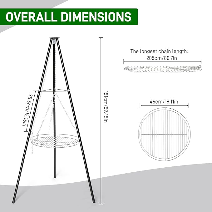 - 【Lightweight and Portable】Designed for easy packing and transport, this compact tripod grill is perfect for camping, hiking, or cooking by the firepit