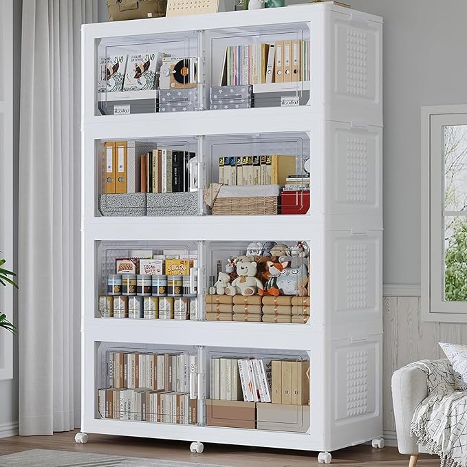 - 【Two Ways to Open & Clear Magnetic Door】The collapsible storage bins with lids and wheels feature a dual access way, allowing for both top and front door openings, and with clear windows for easy visibility. The stackable plastic storage bins with open front doors are equipped with magnetic lock buckles to prevent dust from entering the cabinet.
