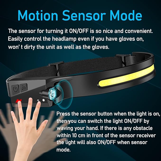 - 【Sensor Headlamp】Headlamp has a basic mode of motion sensing to free your hands. Even if you wear gloves you can easily control the headlamp, when the headlamp is on, select a mode you need, short press the sensor button to start the induction mode, then you can turn the light on/off by waving your hand in front of the sensor receiving point.