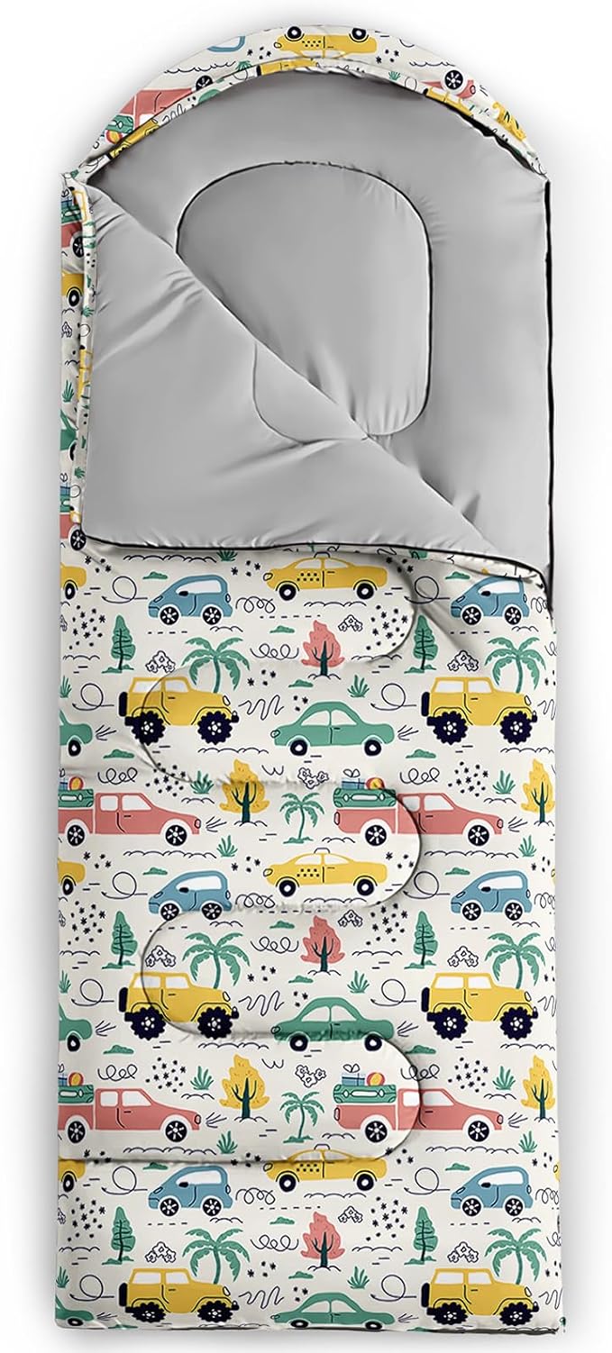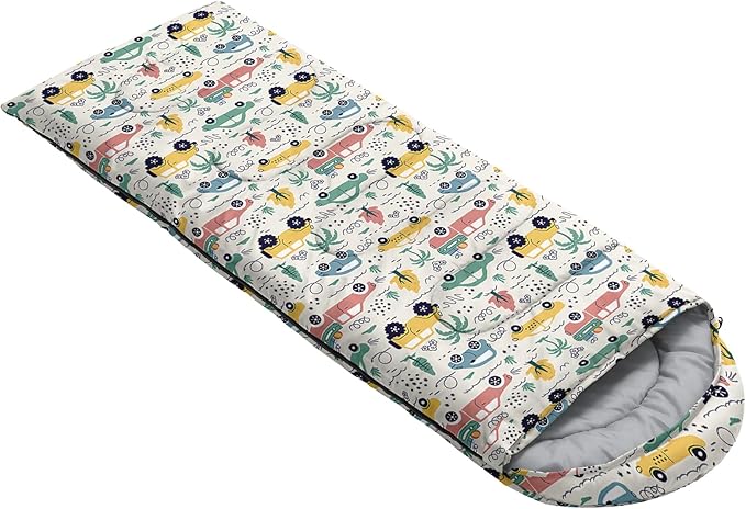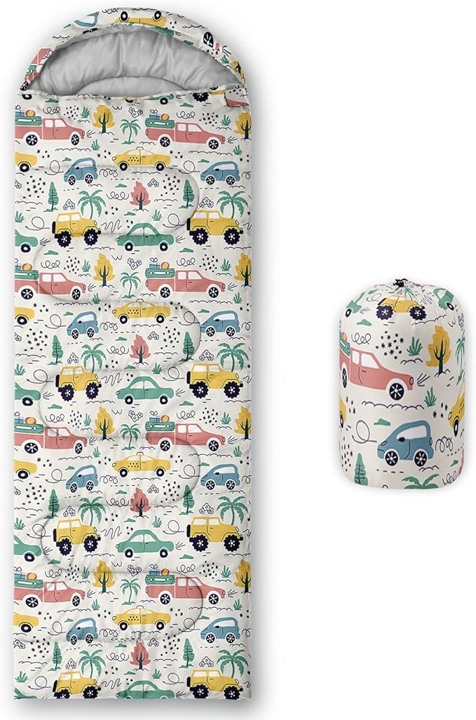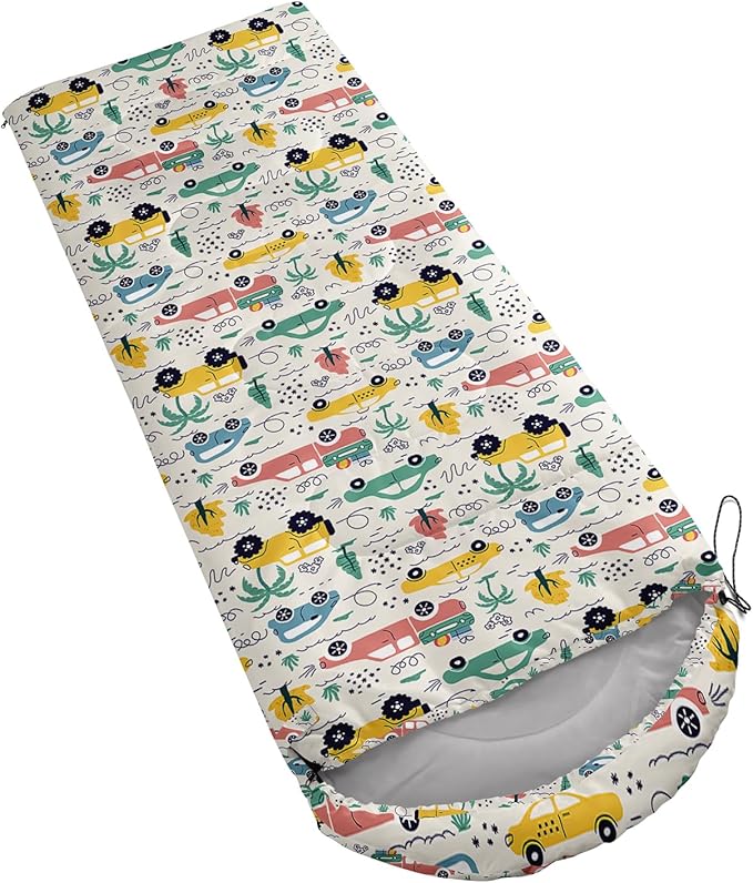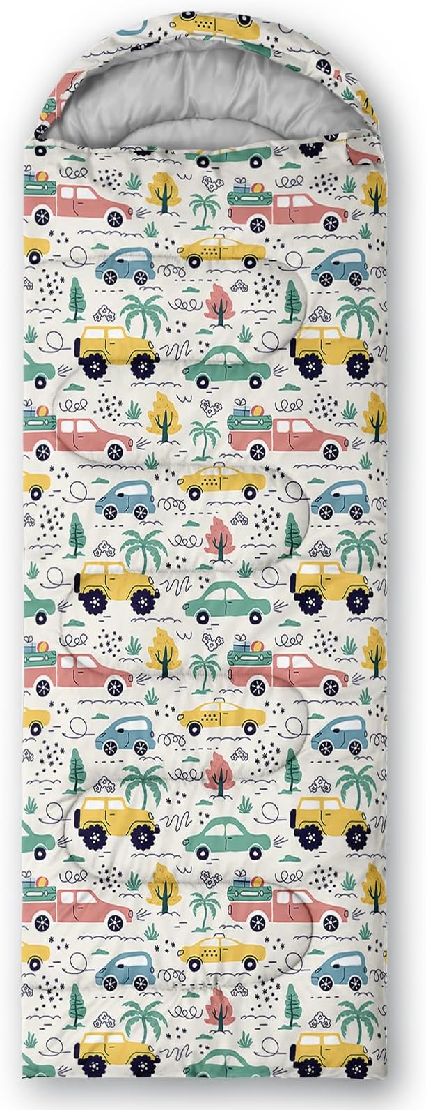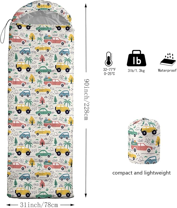 - Unique Car Design:This Car pattern sleeping bag is made of 3D digital printing with vibrant colors and patterns,size: 31W x 90L inches,temperature range: 32℉-77℉ (0℃-25℃),it also also have a weather resistant waterproof design to keep you warm and prevent you from any dampness,can be used in 3 seasons