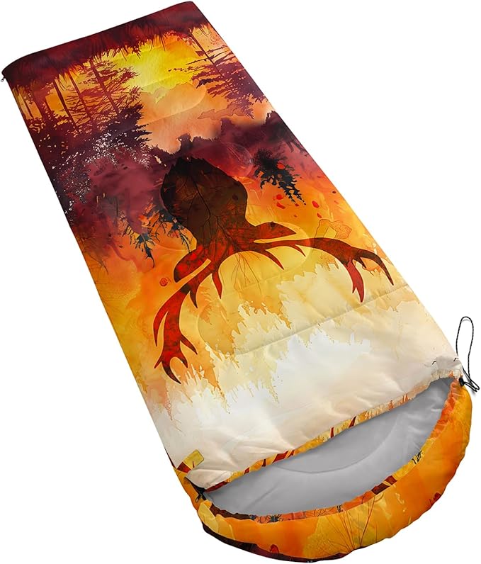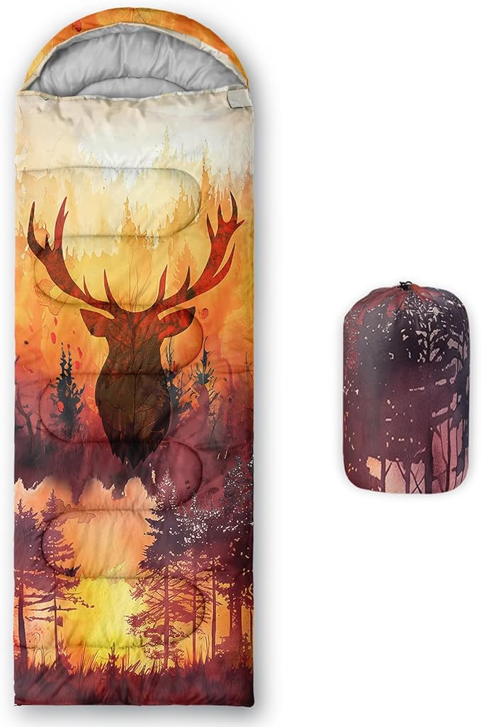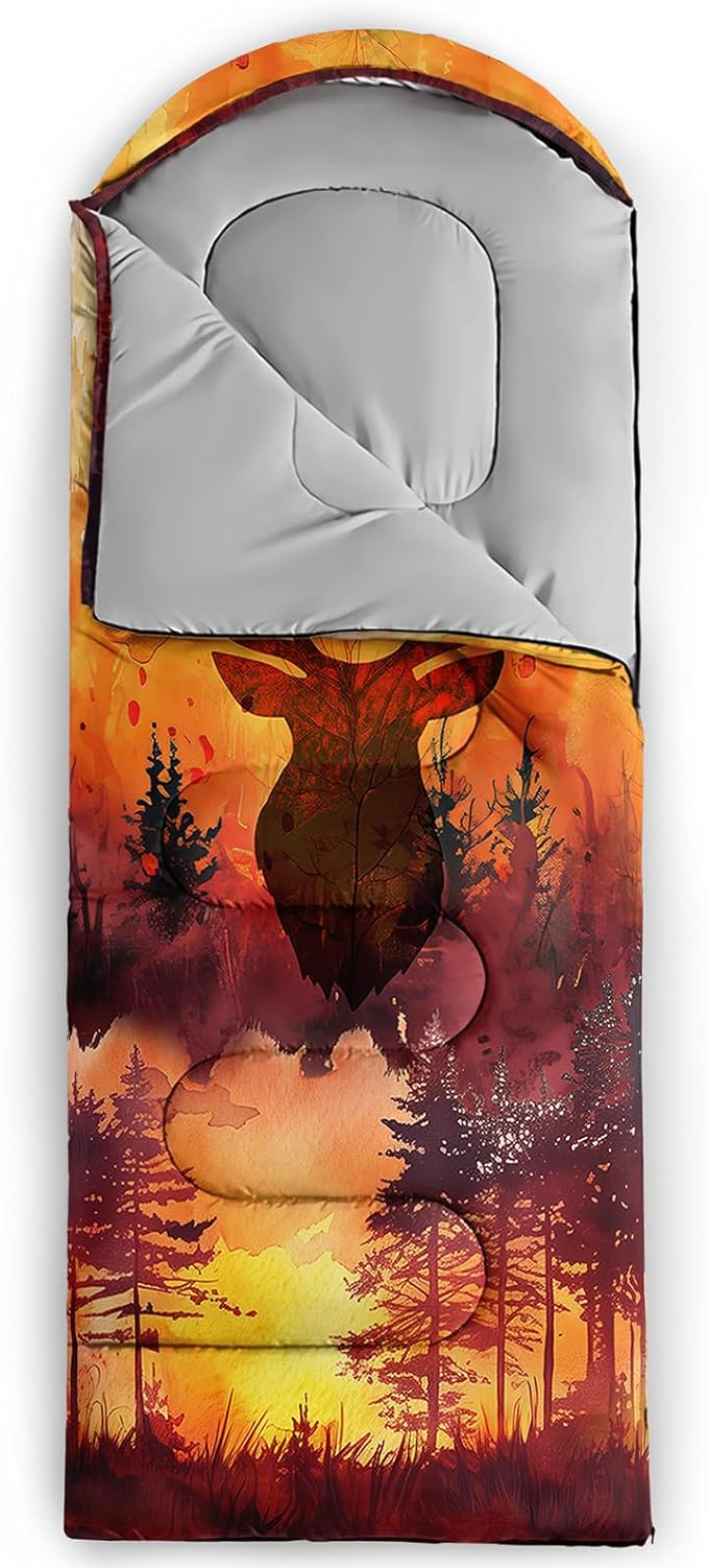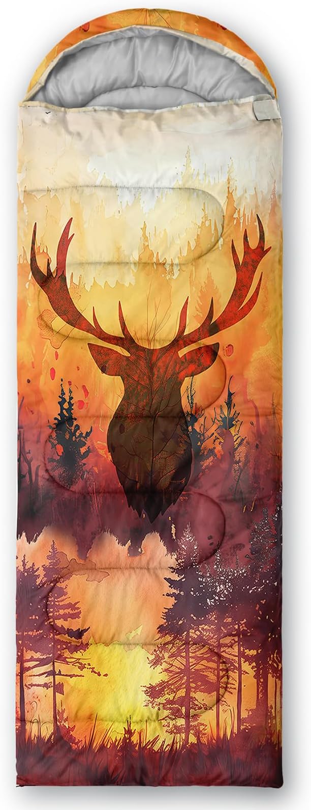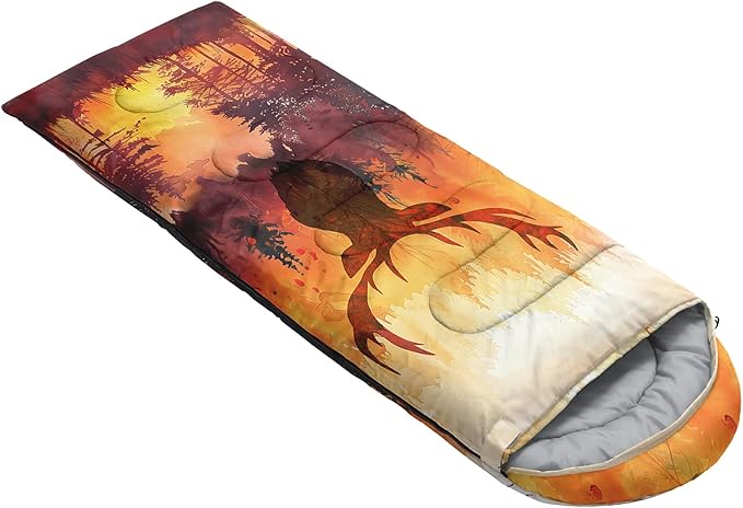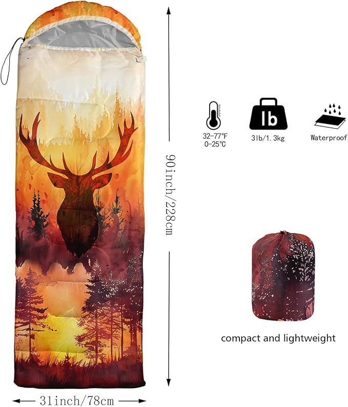 - Unique Deer Design:This Deer pattern sleeping bag is made of 3D digital printing with vibrant colors and patterns,size: 31W x 90L inches,temperature range: 32℉-77℉ (0℃-25℃),it also also have a weather resistant waterproof design to keep you warm and prevent you from any dampness,can be used in 3 seasons