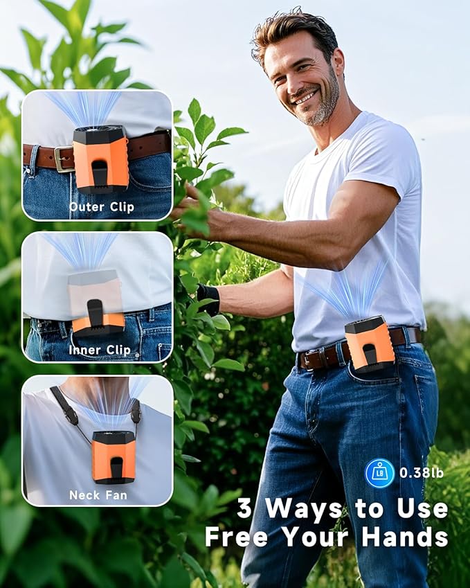 - 【Hands-Free 4-in-1 Cooling Solution】 Stay cool anywhere with this versatile 4-in-1 personal fan! It works as a waist fan, neck fan (with the included lanyard), desk fan, and handheld fan—all in one compact design.Designed for extreme heat, this wearable fan provides powerful, hands-free cooling whether you're indoors or outdoors.
